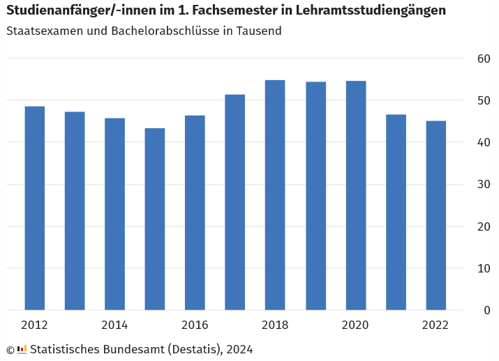 Der Weg zum Beruf der Lehrerin und des Lehrers führt in der Regel über ein Lehramtsstudium. Die Zahl der Studienanfängerinnen und -anfänger (1. Fachsemester), die ein Lehramtsstudium im Bachelor- oder Staatsexamensstudium beginnen, ist im vergangenen Jahr zum zweiten Mal in Folge gesunken. Im Studienjahr 2022 begannen knapp 45 400 Personen ein Lehramtsstudium (1. Fachsemester Bachelor oder Staatsexamen) – das waren 3,2 % weniger als im Vorjahr und 7,0 % weniger als zehn Jahre zuvor.